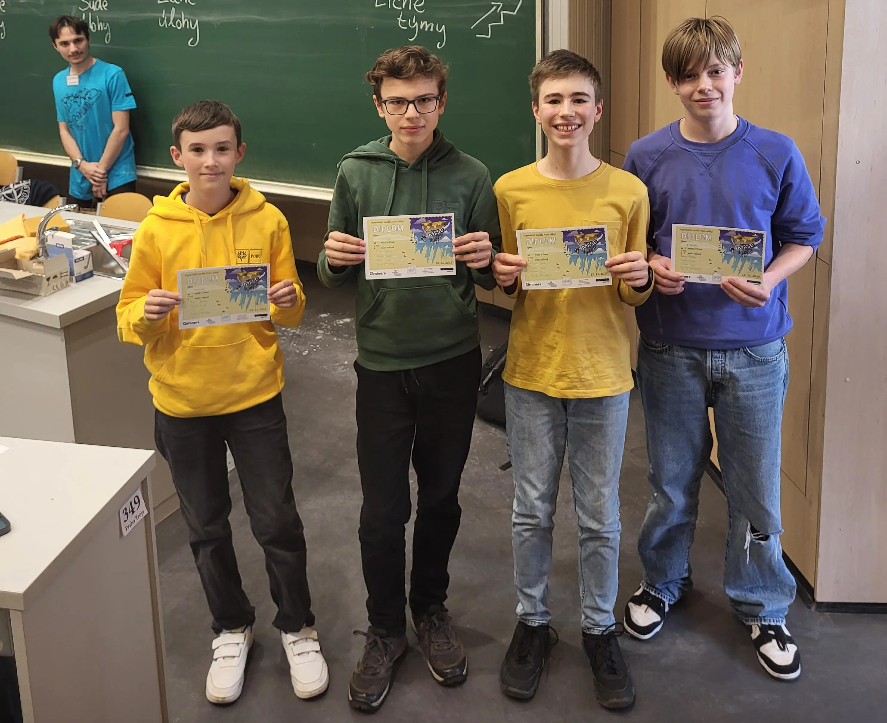Celorepublikově první místo obsadil tým z Gymnázia PORG Libeň ve složení Šimon Boček (kvarta), Vojtěch Krčál (kvarta), Viktor Vojta (sekunda) a Jonáš Mariánek (sekunda), který soutěžil v Praze v Troji.